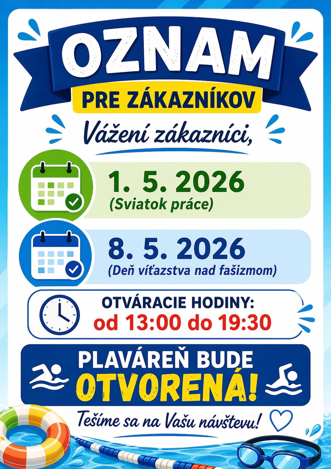 Oznamujeme verejnosti, že prevádzka krytej plavárne v Bánovciach nad Bebravou bude počas Sviatku práce (1.5.) a Dňa víťazstva nad fašizmom (8.5.) otvorená počas bežných otváracích hodín, a to od 13:00 do 19:30 h.